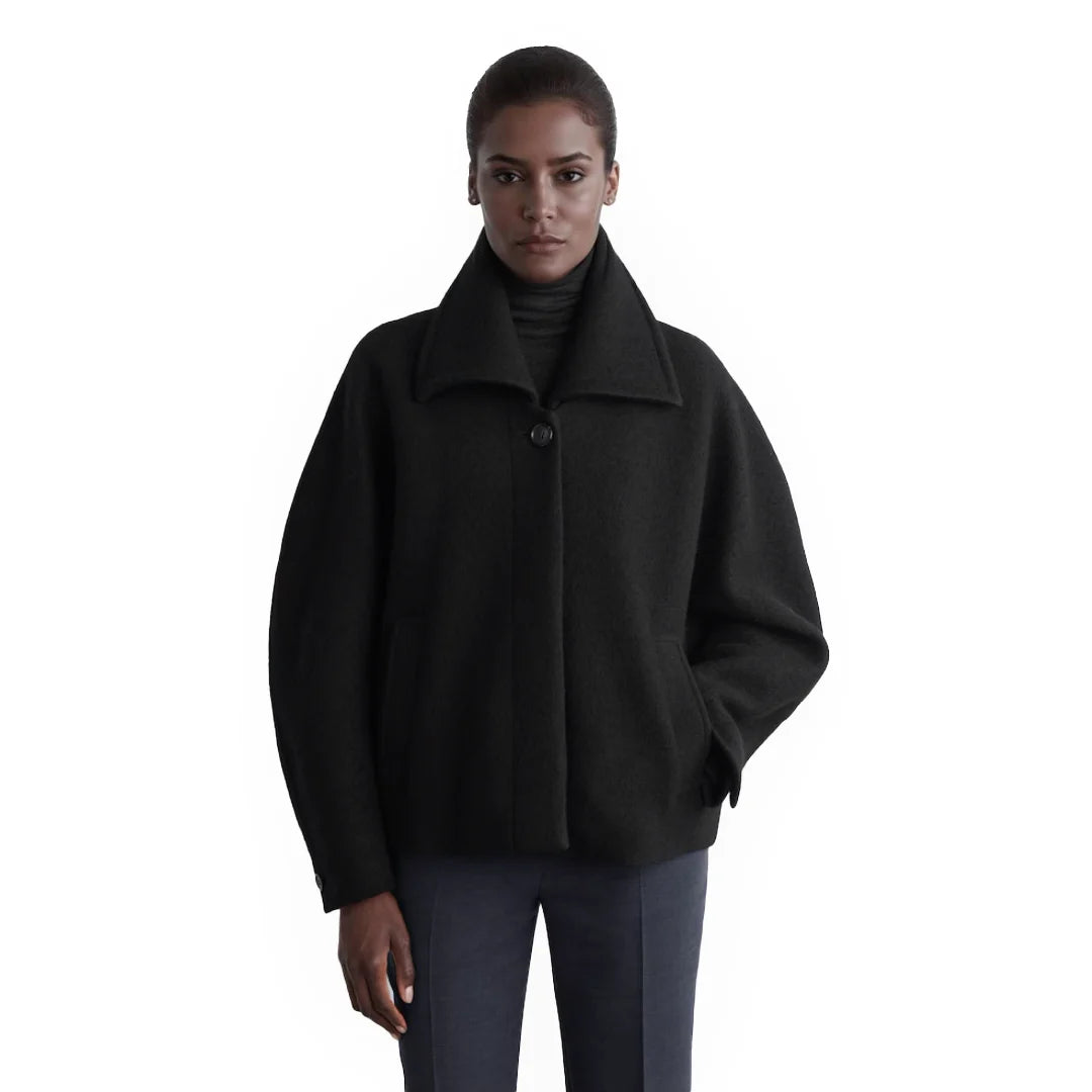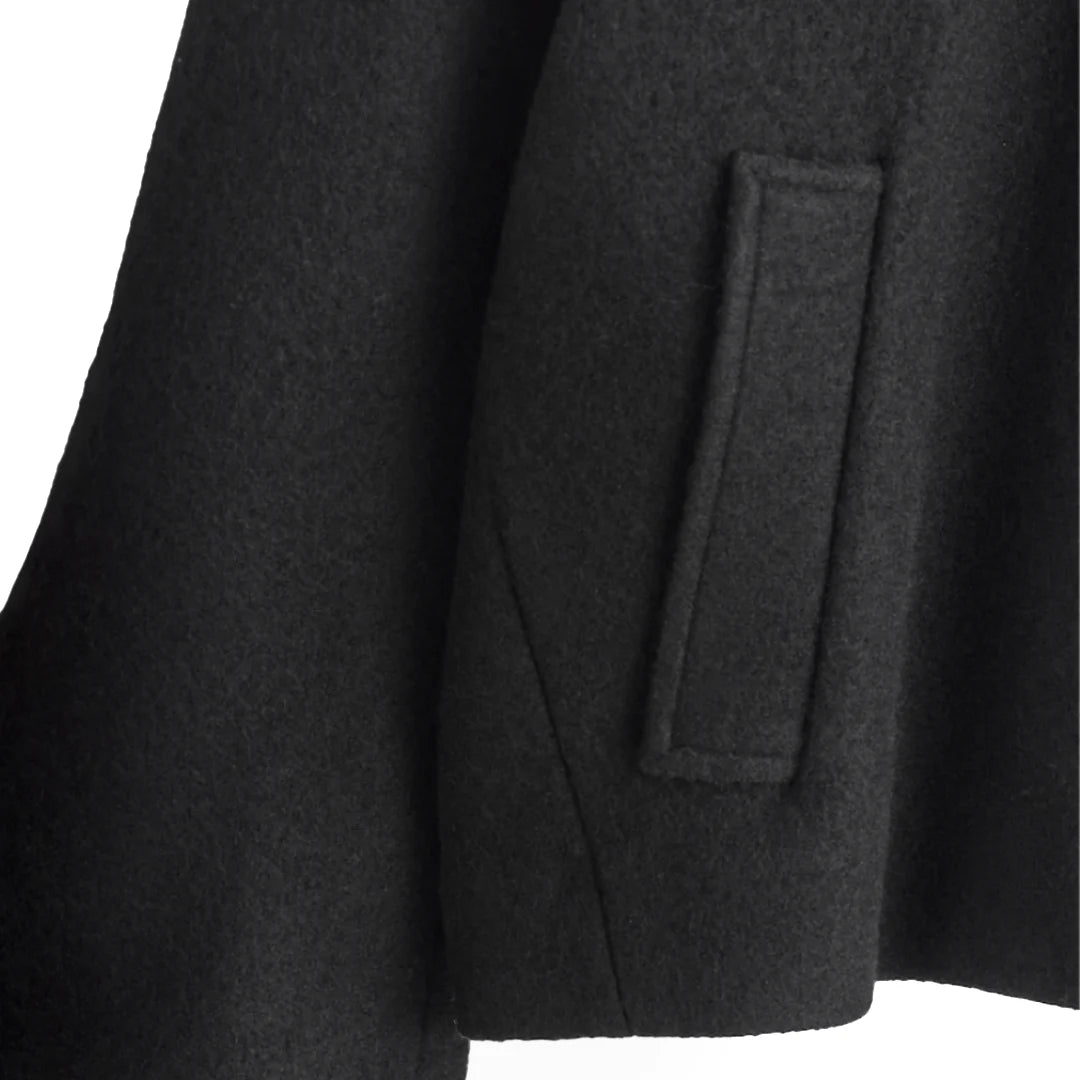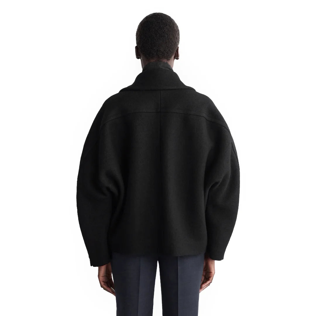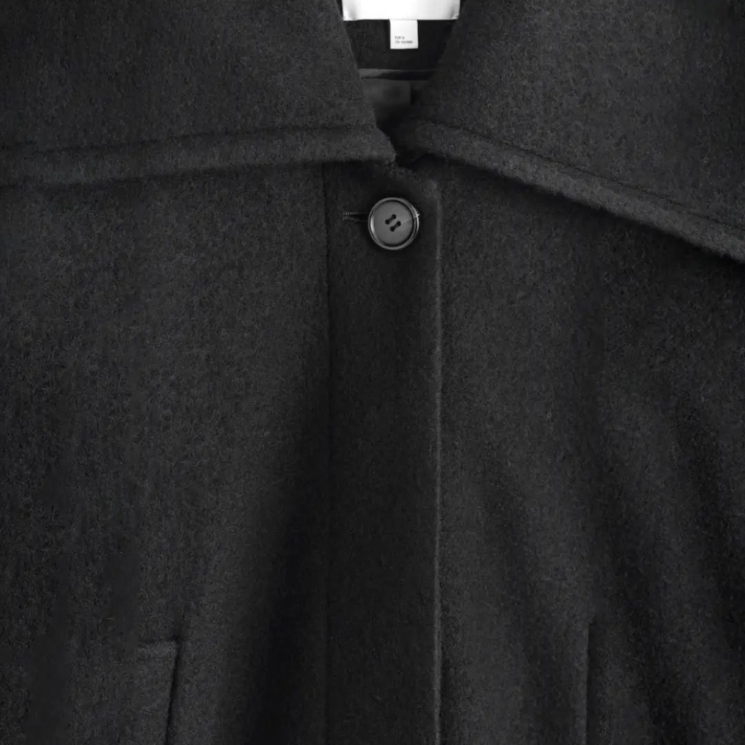 The "Shadow Whisper Wool Coat" is a standout piece from our collection, blending modern sophistication with thoughtful design. Crafted from premium boiled wool, this coat features a rounded silhouette with a wide collar, concealed placket, and welt pockets, offering a luxurious and versatile addition to any wardrobe. Made with Responsible Wool Standard (RWS) certified wool, it ensures ethical animal welfare and land-management practices. Our model wears a size S with a back length of 24.17", showcasing its elegant fit.