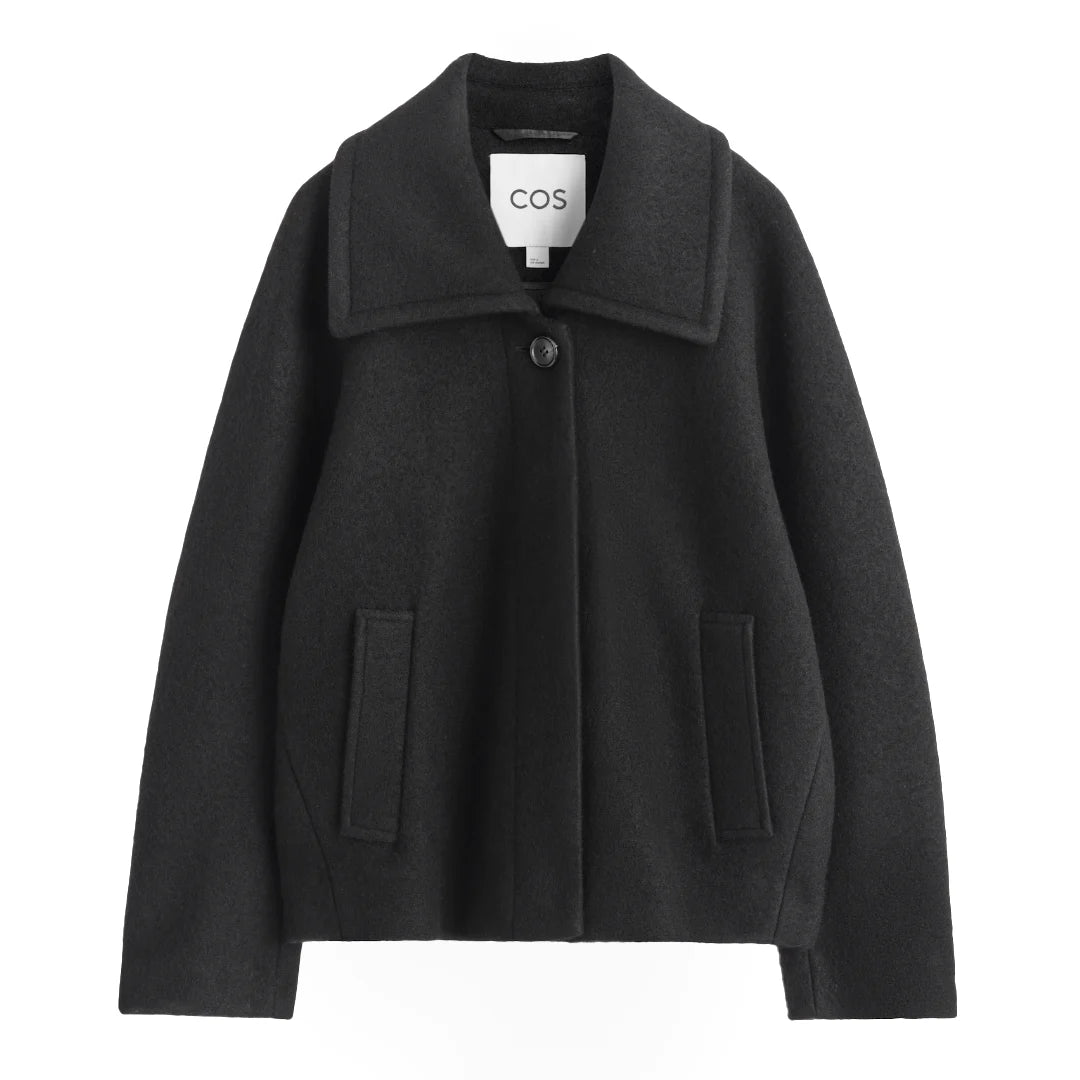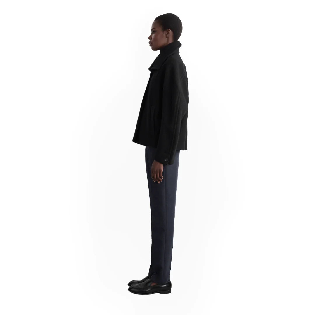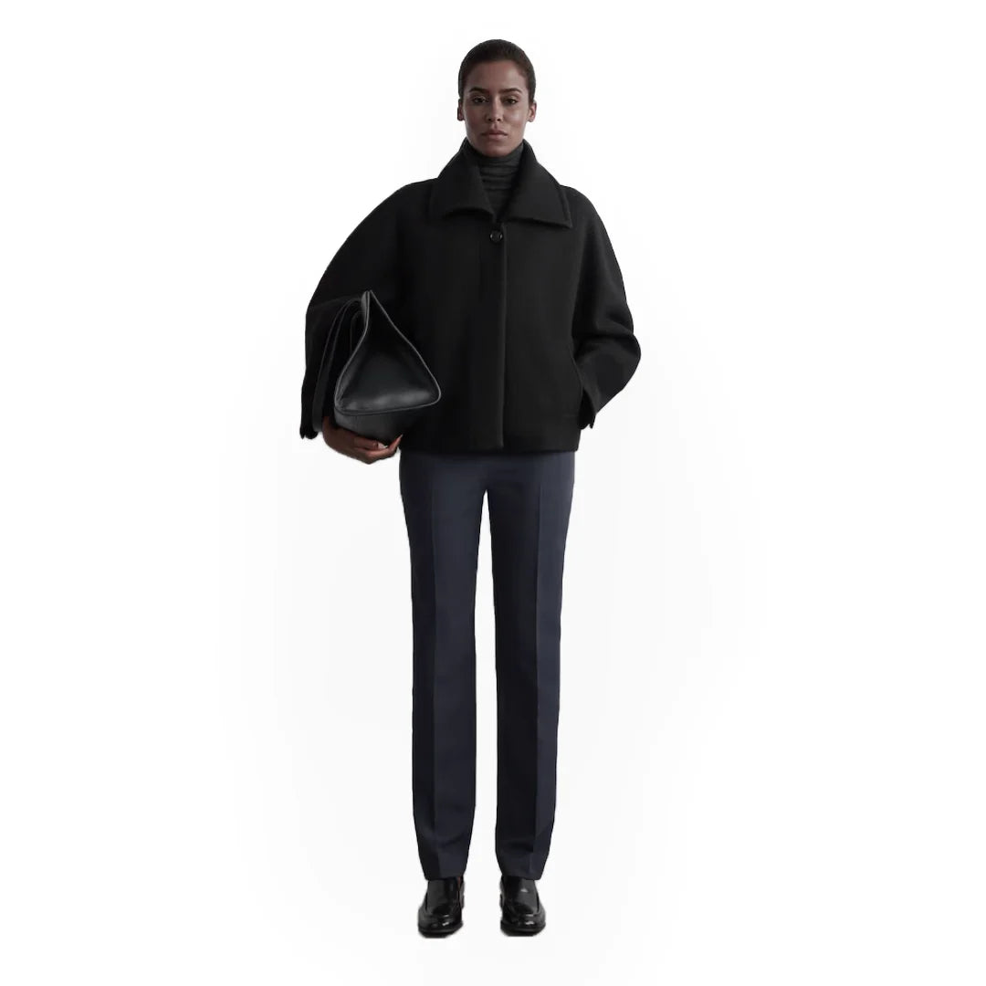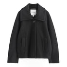 The "Shadow Whisper Wool Coat" is a standout piece from our collection, blending modern sophistication with thoughtful design. Crafted from premium boiled wool, this coat features a rounded silhouette with a wide collar, concealed placket, and welt pockets, offering a luxurious and versatile addition to any wardrobe. Made with Responsible Wool Standard (RWS) certified wool, it ensures ethical animal welfare and land-management practices. Our model wears a size S with a back length of 24.17", showcasing its elegant fit.