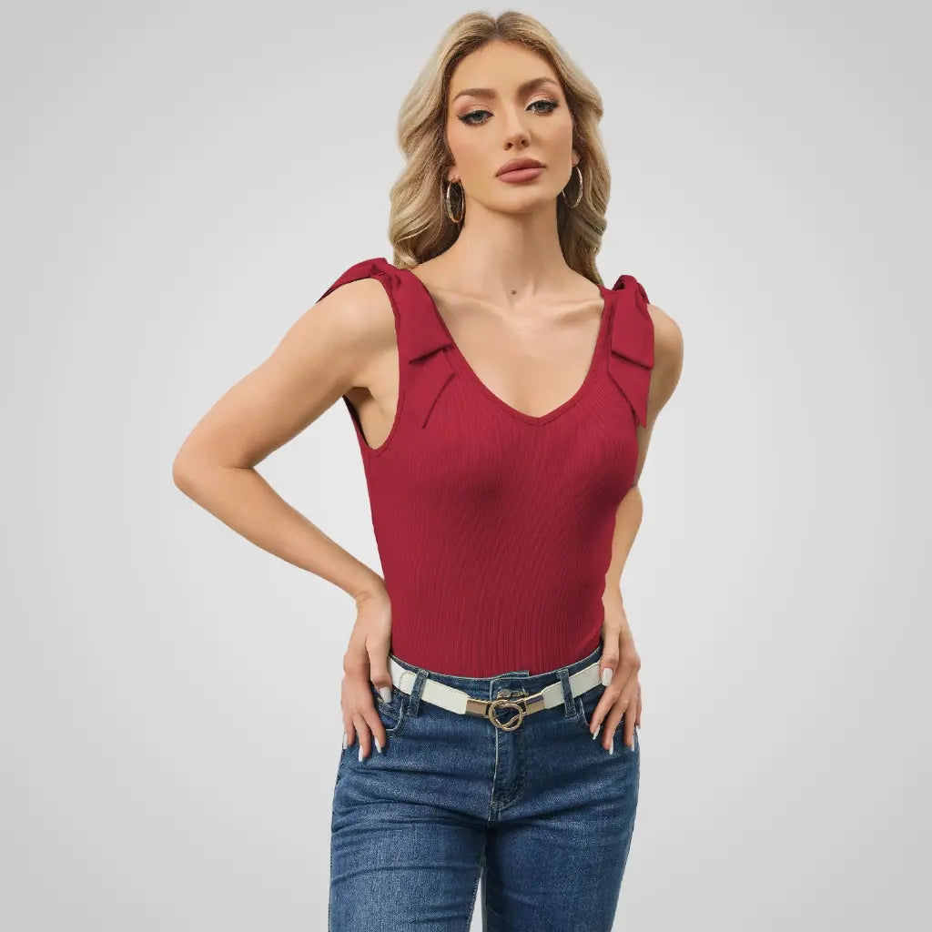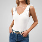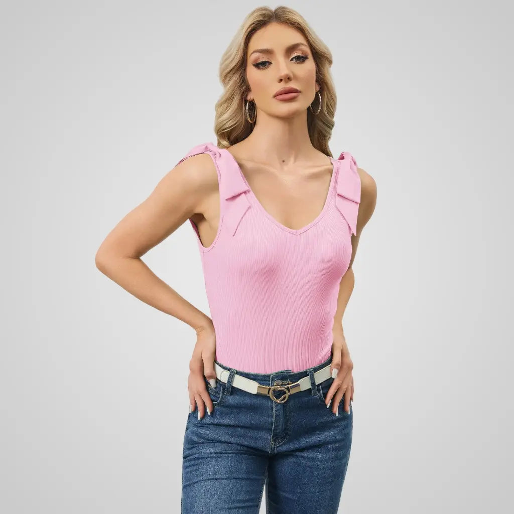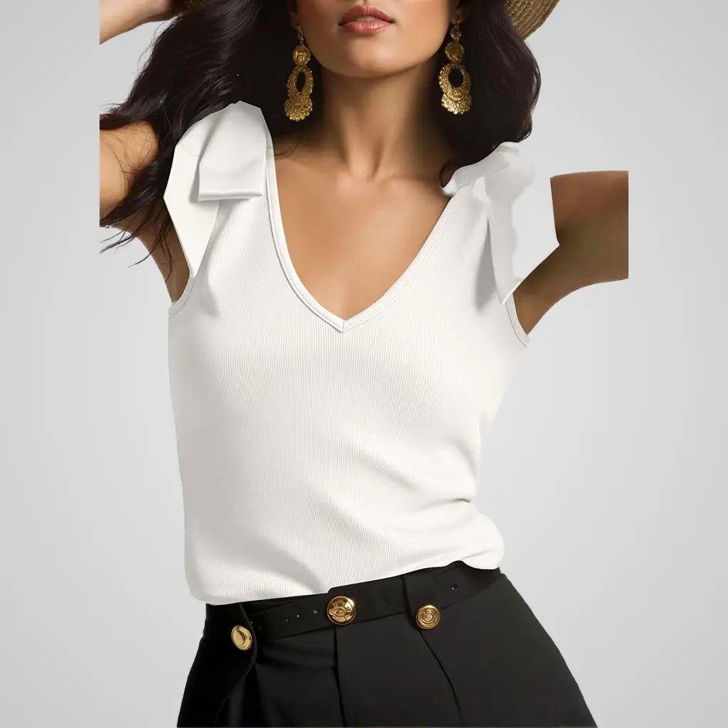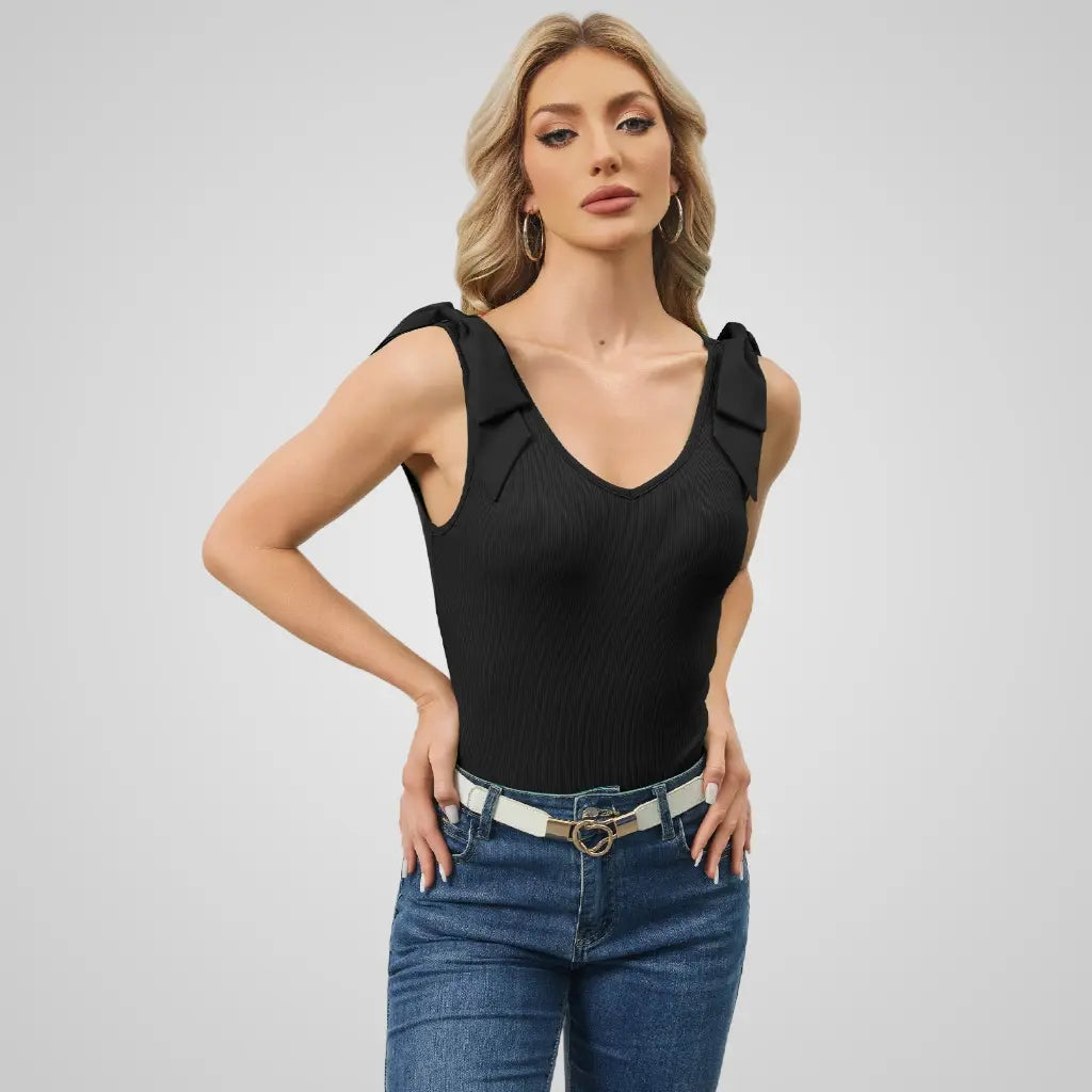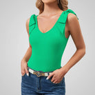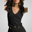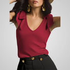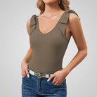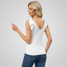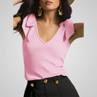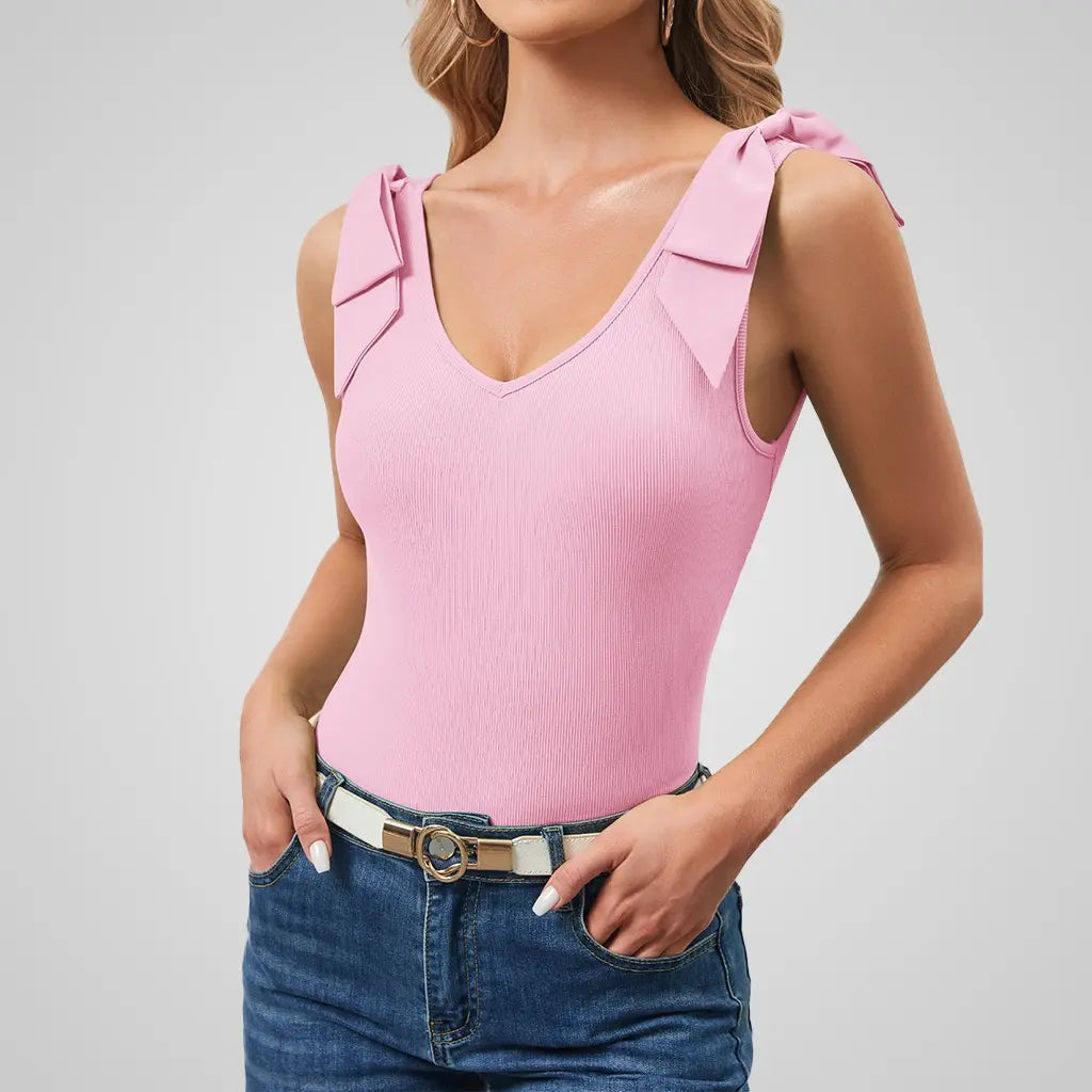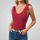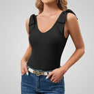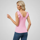 Stay effortlessly chic this summer with the FireSwan Women’s V-Neck Bow Tie Shoulder Tank Top. Crafted from a soft rayon-cotton blend with a touch of stretch, this ribbed knit camisole hugs your shape while keeping you comfortable all day. The playful pre-tied bow shoulder straps add a cute, feminine touch, while the sexy deep V-neckline gives it a trendy edge. Perfect for pairing with denim shorts, skirts, or high-waist pants, this sleeveless knit top is your go-to for vacations, casual days, date nights, and summer parties.